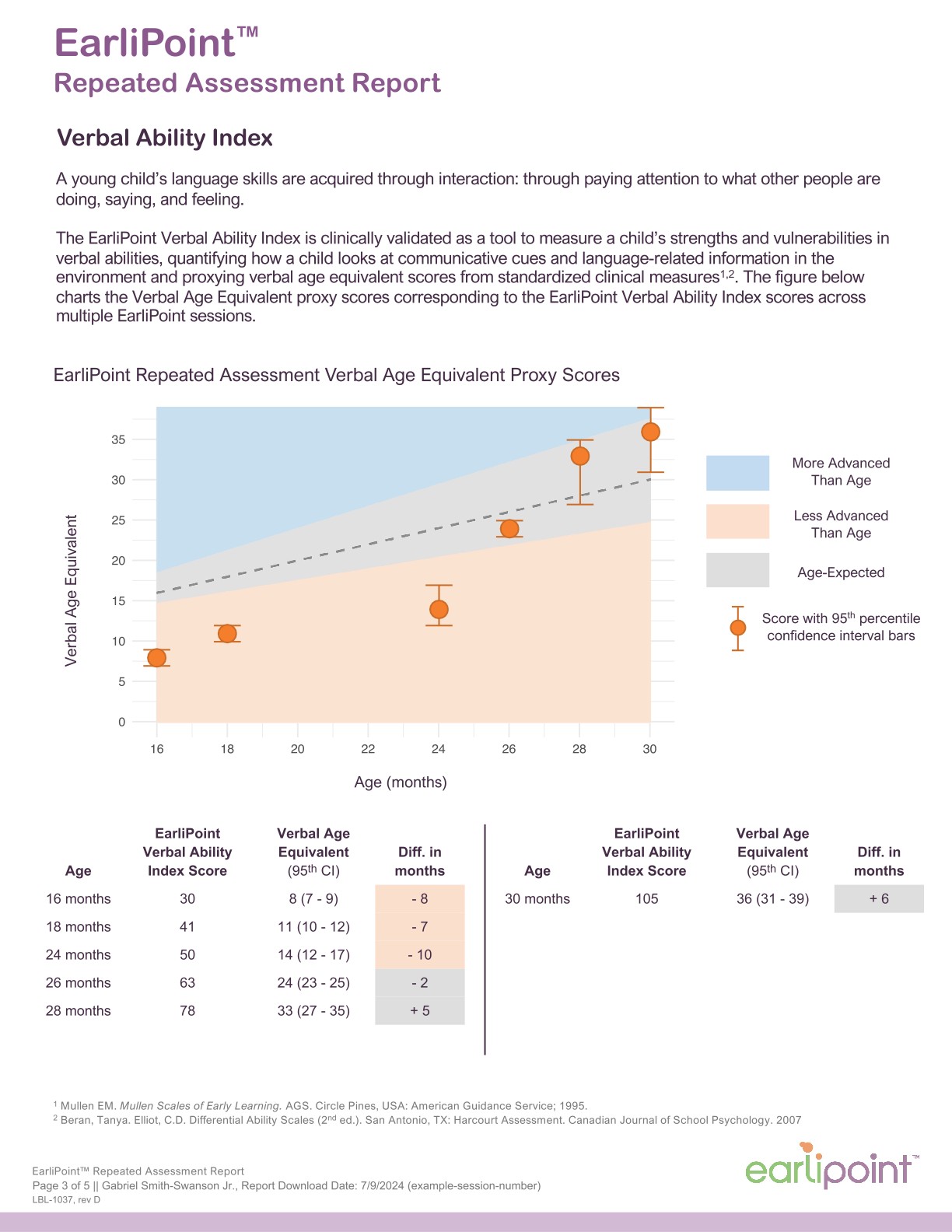 The system generates a detailed report showing the child’s scores across three clinically aligned indices: language, cognition, and social engagement. These insights support early detection and help track progress over time.